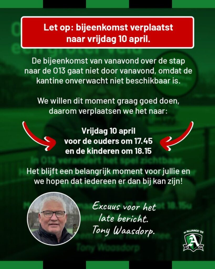 Beste spelers en ouders, De bijeenkomst van vanavond over de overgang naar de O13 kan helaas niet doorgaan, omdat de kantine onverwacht bezet is. We…