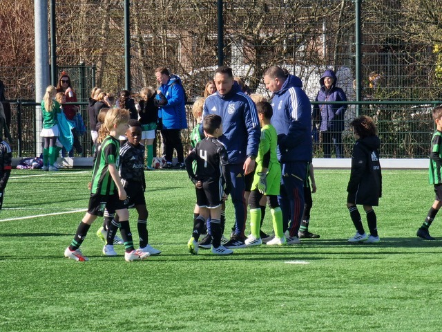 Na een serieuze voorbespreking met overgeconcentreerde gezichtjes was het dan zo ver. Het zonnetje scheen, er was veel publiek gekomen en onze mannen waren meer dan klaar om eens goed gas te geven. Het spel kwam wat aarzelend op gang maar na een snel tegen doelpunt van Ajax waren ze wakker.