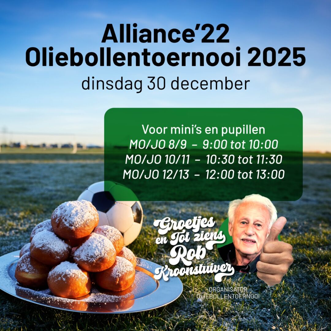Ook dit jaar organiseer ik weer het jaarlijkse Oliebollentoernooi van Alliance ’22, een gezellige ochtend vol voetbal, plezier en natuurlijk… oliebollen.