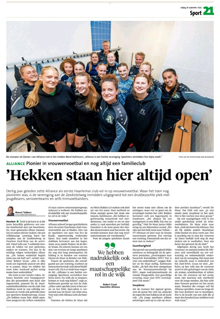 Vrouwen 1 van Alliance is een bijzonder team: de jongste meiden zijn vijftien jaar, de oudste wordt binnenkort dertig. En dat gaat bijzonder goed samen! Niet alleen omdat de meiden allemaal een lekker potje kunnen voetballen, maar vooral omdat groen-zwart in hun hart zit. Ook de jonge meiden voetballen al jaren bij Alliance. En dat schept een band die leeftijden overstijgt en overbrugt. En dat valt op! Zo heeft afgelopen vrijdag het Haarlems Dagblad een mooi artikel over onze VR1 als team geschreven: