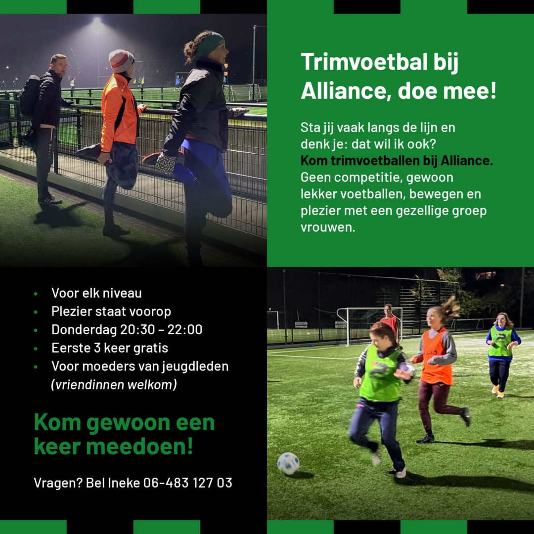 Sta jij elke week langs de lijn je kind aan te moedigen… en denk je stiekem: dat lijkt me eigenlijk ook leuk? Dit is je kans. Trek je sportschoenen aan en doe mee met Trimvoetbal bij Alliance.